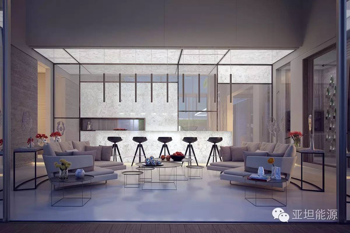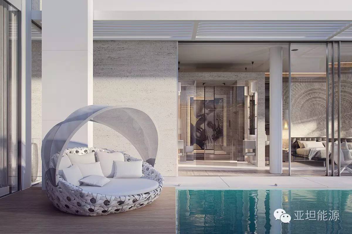 这款别墅仍旧将玻璃墙进行大范围使用,而室内与室外泳池的连接也最大限度运用了圆柱进行搭配,既节省空间又提高了观赏性。同样的,在屋顶仍然利用了太阳能发电系统进行家庭能源供给。