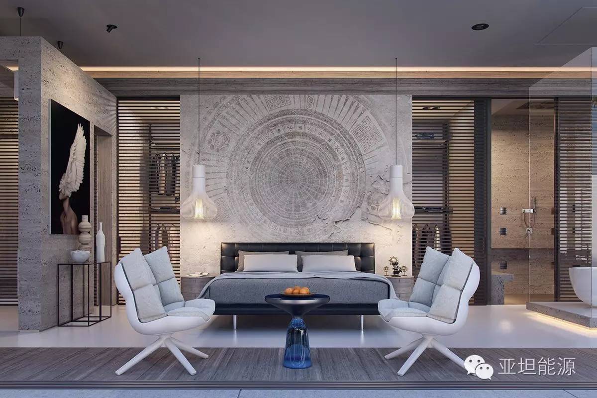 下面就一起来看看主人套房。一个独立的混凝土墙遮挡它后面的更衣室,这是一个非常惊人的聪明设计。