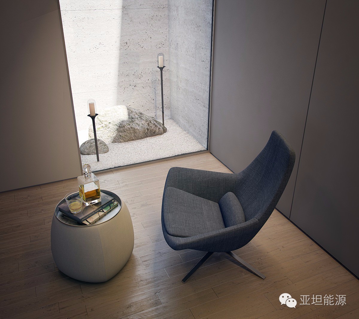 回到别墅整体外形设计,建筑材料和形式的对比让整个房子与周围自然完美融合,同时在房屋的屋顶,还装有太阳能光伏发电系统,让别墅本身更增添许多环保与自然属性。