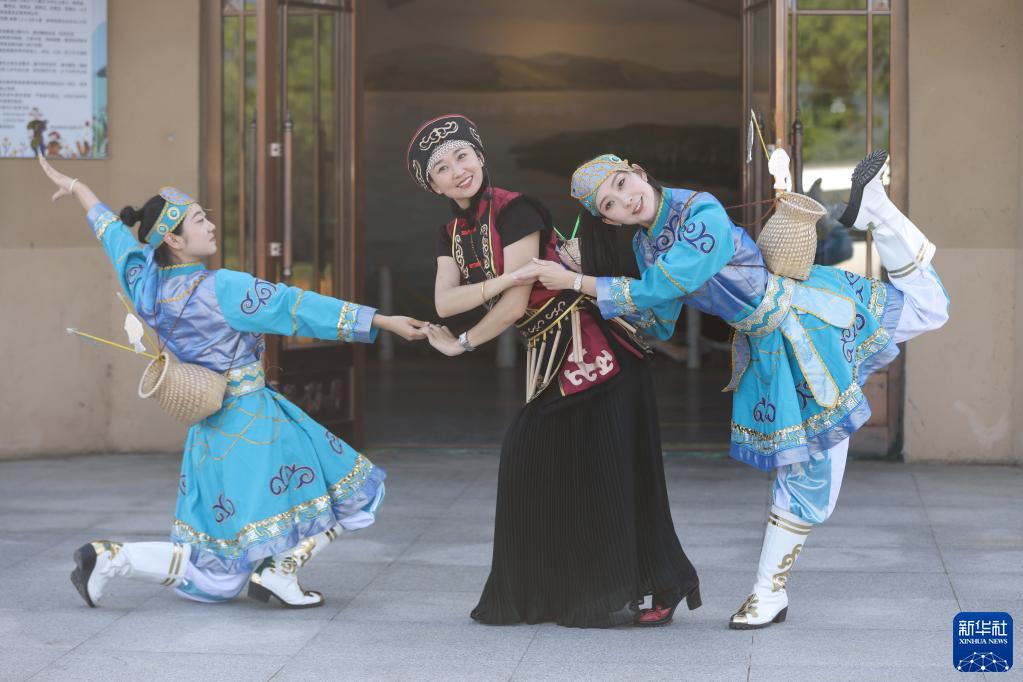 9月4日,工作人员在赫哲民俗展示馆前表演赫哲族舞蹈。新华社记者 张涛 摄