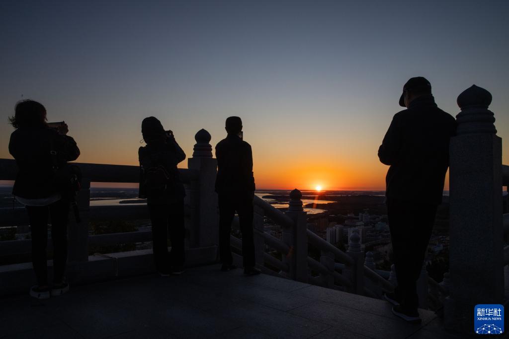 9月4日,游客在抚远市“东极阁”看日出。新华社记者 张涛 摄