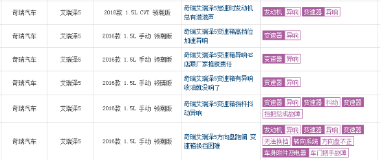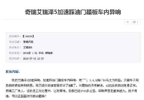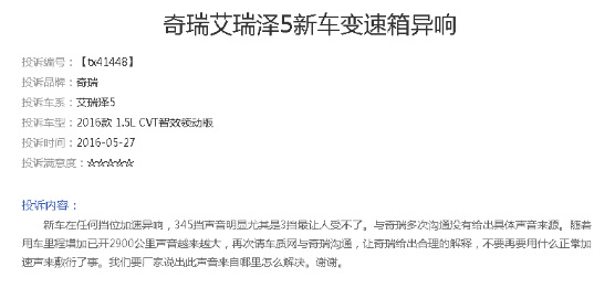 以上两个截图分别来自汽车门网和车质网,两位车主都投诉称自己的艾瑞泽5不管在什么挡位,只要一加速就有异响,特别是3、4、5挡尤为明显,并且随着公里数增加,声音越来越大。与厂家沟通,直到现在还没有解决方案。
