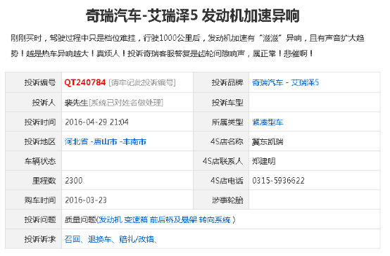 这位来自汽车投诉网的车主投诉称,自己刚买车时就出现挡位挂的情况,在行驶1000公里后,发动机加速时有“滋滋”异响,并且有扩大的趋势,越是热车异响越大。投诉奇瑞厂家,得到的答复是齿轮间隙响声,属于正常现象。