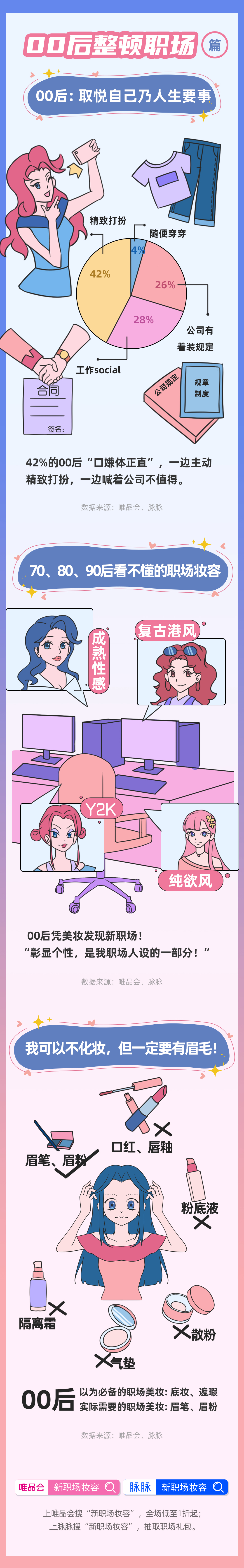 问卷结果显示,虽然42%的00后职场新人每天都打扮精致地去上班,但他们的内心都在默默呐喊“不值得”。在部分00后眼中,职场是个性化展示的舞台,他们乐于创造代表着独特审美的“新职场妆容”。在00后的推动下,职场妆容的边界进一步拓宽,“成熟性感”、“复古港风”、“纯欲风”、“Y2K”等多元化风格在办公室里“百花齐放”。
