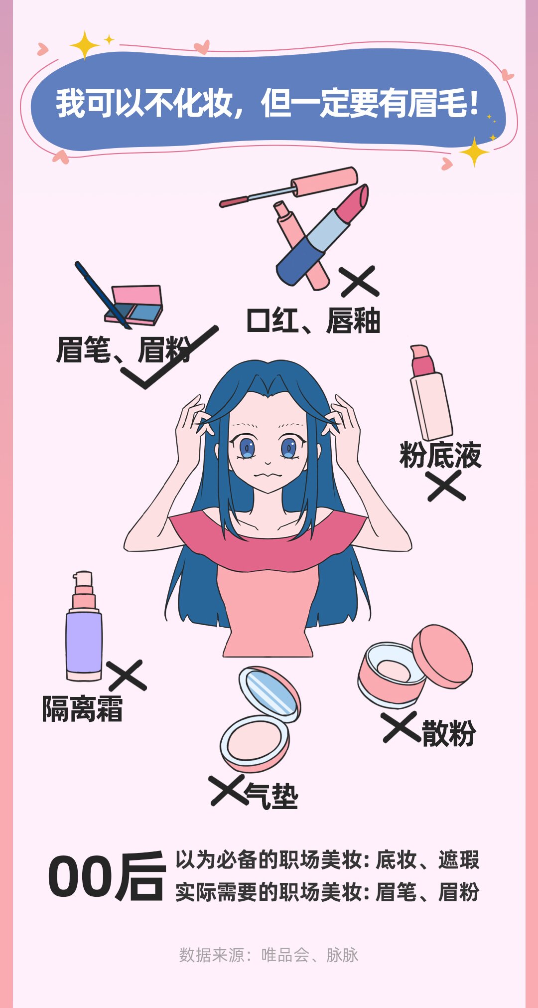 同时,讲究仪式感的00后也更倾向于在办公室打造一个舒适、自在的环境,办公桌上不乏护手霜、喷雾、口红、粉底、腮红等各种变美好物。虽然大部分00后的第一件职场美妆单品是粉底,但被他们票选出来的“上班最必要单品”却是眉笔,眉毛成为00后职场人在化妆时最关注的五官。