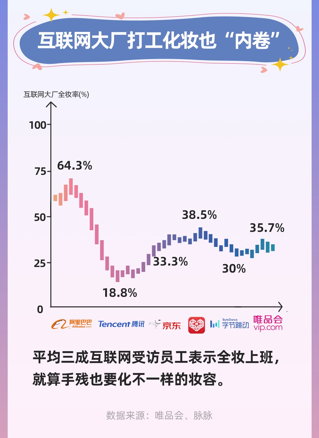 在美妆消费上,互联网行业的“内卷”特性也体现得淋漓尽致,有三成互联网行业受访者认为“同事太精致,我也要跟上”。因此,不仅有“技术大牛”每天翻着花样地化妆上班,也有“手残党”表示就算化妆技能不达标,也要“解锁”新妆容。其中,电商企业的“全妆率”最高,在30%以上。