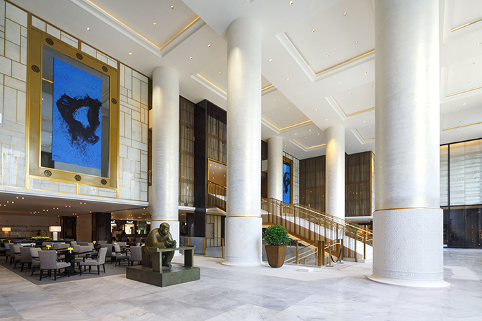 大堂两幅颇有气势的水墨画由著名中国前卫艺术家秦风创作,在钴蓝色的背景上描绘了日月,点缀主楼梯两侧;前方是艺术家张渡创作的品茶士青铜雕塑