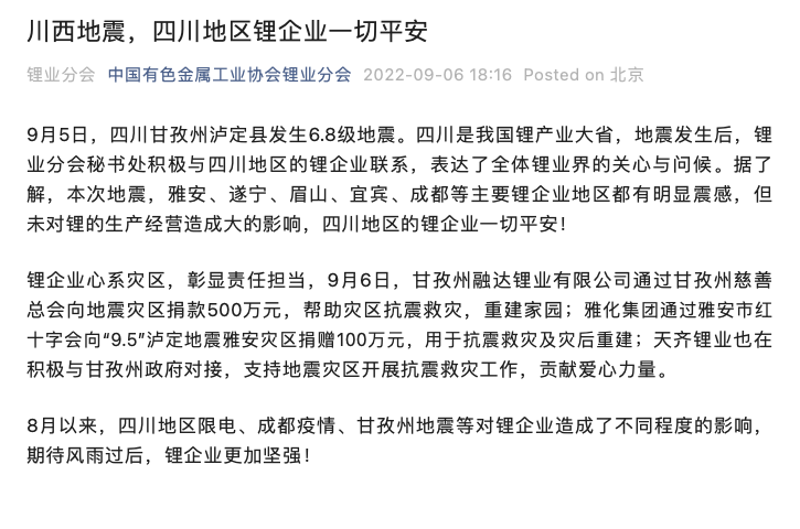 9月6日,中国有色金属工业协会锂业分会官微发布消息称,9月5日,四川甘孜州泸定县发生6.8级地震。据了解,本次地震,雅安、遂宁、眉山、宜宾、成都等主要锂企业地区都有明显震感,但未对锂的生产经营造成大的影响,四川地区的锂企业一切平安。