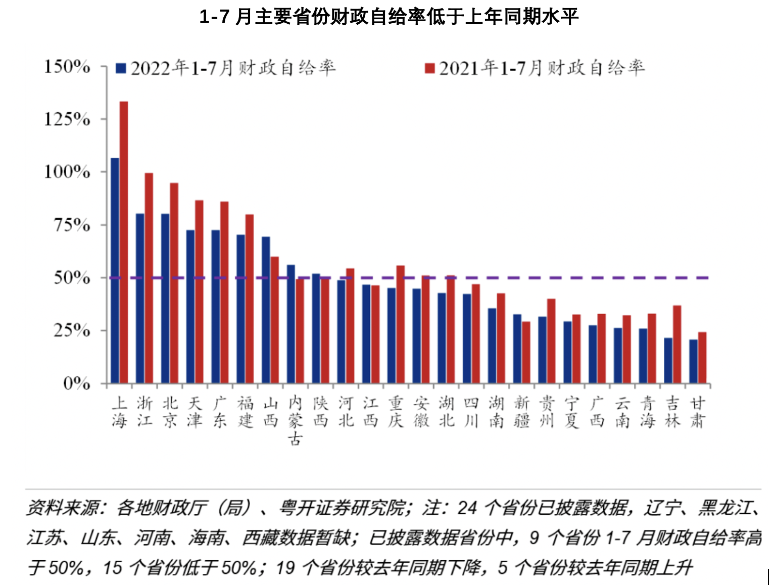 受疫情冲击和留抵退税影响,1-7月一般公共预算收入自然口径同比-9.2%;同时受房地产风险影响,土地出让收入同比为-31.7%。如果房地产风险未明显软着陆,按此计算,全年预计将较去年减少约2.6万亿土地出让收入,直接导致地方可支配财力下降;部分高度依赖土地出让收入的地区将受到较大影响,目前民营房企整体遇到现金流困难,部分城投摇身一变通过拿地的方式为地方政府输血,但是城投也面临债务问题,这可能会导致城投与财政风险进一步捆绑。地方“三保”压力依然较大,财政自给率下降,一半以上省份财政自给率不足50%,上半年31省份收支差全部转负,意味着对转移支付和债务的依赖度提高。1-7月,已公布数据的24个省份中,15个省份财政自给率低于50%,9个省份高于50%;19个省份较去年同期下降。1-7月,一般公共预算收支差为-21770亿元,收支差绝对值高于历史同期,靠前发力的同时部分透支了下半年财政空间。