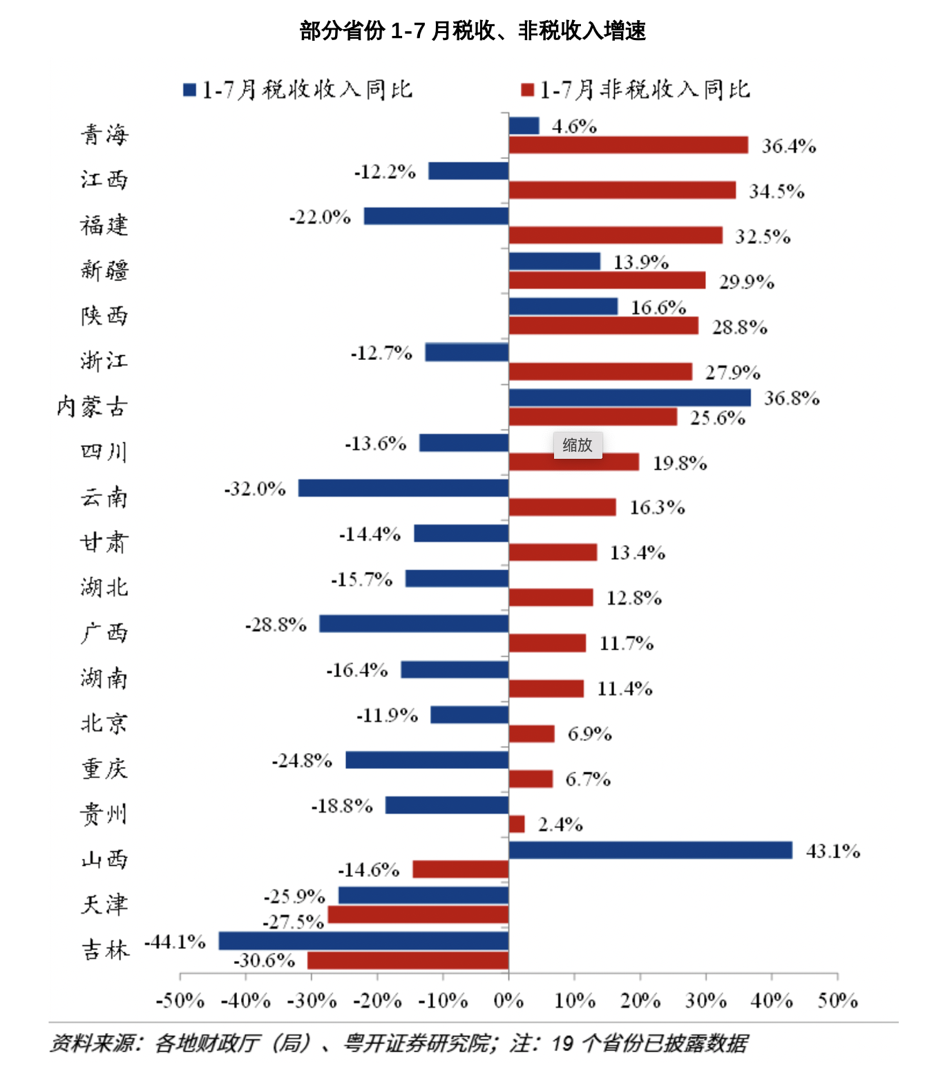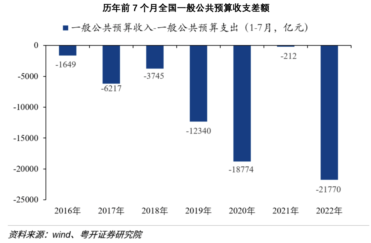 1-7月,全国税收收入和非税收入累计同比分别为-13.8%和19.9%,即非税收入增速大幅高于税收收入增速33.7个百分点,主要与地方政府多渠道盘活闲置资产有关。1-7月税收收入占比为82.2%,低于2019-2021年同期的86%、85.9%、86.5%,由于非税收入的稳定性相对更差,非税收入占比上升意味着财政收入的稳定性下降。