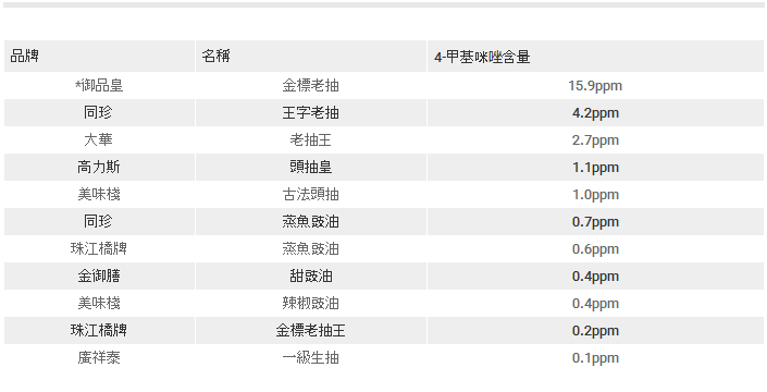 世界卫生组织已将4-甲基咪唑列为可能致癌物质,美国加州规定产品如令人每天摄入大于29微克,须在包装上加警告字句。但以“御品皇金标老抽”为例,使用半茶匙(2毫升)就等于摄于31.8微克,严重超出应有指标。
