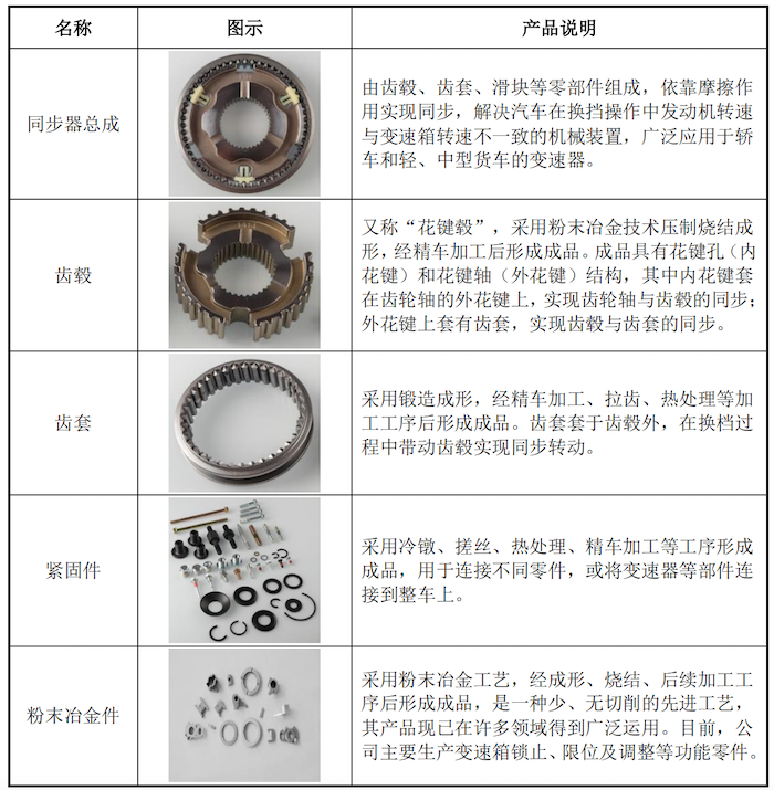 迅达工业主要从事汽车传动系统零部件产品的研发、生产和销售,公司产品包括(汽车变速器用)同步器总成、紧固件及其他。