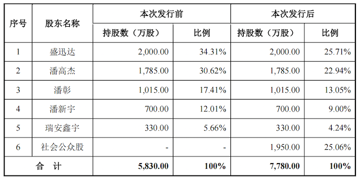 此轮上市,发行前迅达工业股东人数只有5人。其中,盛讯达为公司控股股东,持有迅达工业2000万股股份,占发行前股份数量的比例为34.31%,实际控制人为潘高杰、其儿子潘新宇、兄弟潘彰三人,三人通过直接和间接的方式合计持有公司94.34%的股份,此外,员工持股平台瑞安鑫宇持有5.66%的股份。