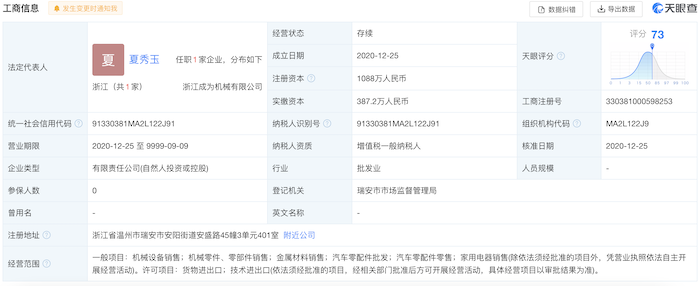 天眼查显示,浙江海象机械有限公司已于2021年3月1日被注销,公司成立于2018年,股东为蔡冉和金寿海;而浙江成为机械有限公司成立于2020年,股东为夏秀玉和蔡高贵,该公司的参保人数为0人。