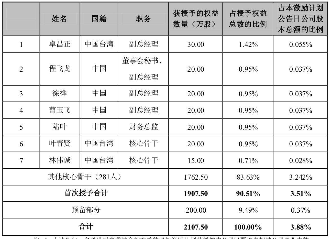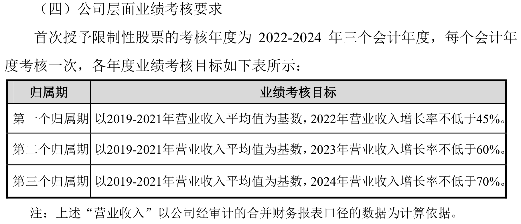 当然,最受关注的还是考核目标。根据披露,首次授予限制性股票的考核年度为2022-2024年三个会计年度,每个会计年度考核一次,即以2019-2021年营业收入平均值为基数,2022年、2023年、2024年的营业收入增长率分别不低于45%、60%、70%。预留部分若在2022年第三季度报告披露之前授予,则同上;若预留部分在2022年第三季度报告披露之后授予的话,那么,预留部分业绩考核年度为2023-2025年三个会计年度,每个会计年度考核一次,即以2019-2021年营业收入平均值为基数,2023年、2024年、2025年营业收入增长率分别不低于60%、70%、85%。另根据后续披露,首批授予给副总经理卓昌正、董事会秘书兼副总经理程飞龙、副总经理徐桦、副总经理曹玉飞、财务总监陆叶、核心骨干叶青贤和林伟诚,以及另外281名其他核心骨干。