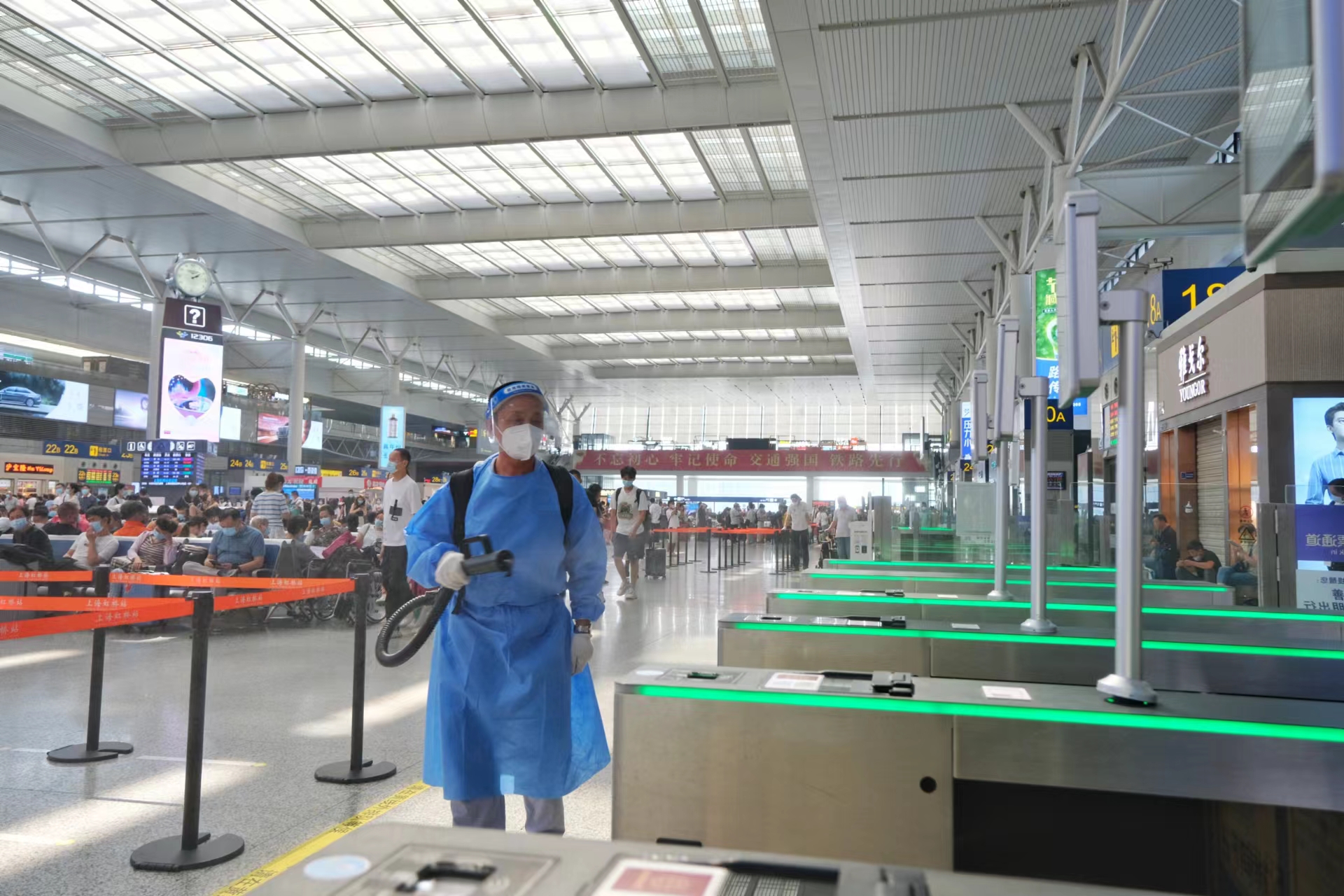针对近期本土疫情多点散发的形势,铁路上海站在做好旅客运输的同时,从严从紧抓好各项常态化疫情防控措施,加强疫情防控广播宣传,增派人手定期在候车室内巡视,及时提醒旅客范佩戴口罩;加强对电梯扶手、门把手、进站闸机、安检设备、卫生间等重点部位保洁和消毒;保持公共场所空气清新、温度适宜、环境整洁,全力做好疫情防控和运力保障工作。