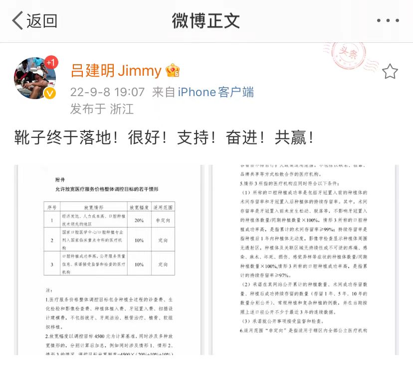 就在9月8日晚,通策医疗董事长吕建明还通过微博发文表示,“靴子终于落地!很好!支持!奋进!共赢!”在吕建明微博中,其同时还放出放宽条件的文件截图。该文件全名为:允许放宽医疗服务价格整体调控目标的若干情形。它是此次正式文件的附件。