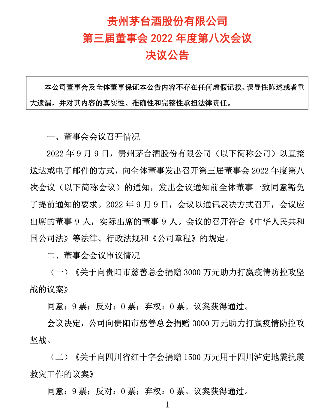 9月9日,贵州茅台酒股份有限公司(以下简称“贵州茅台”)发布公告显示,公司向贵州、四川两省捐赠4500万元,用于当地抗疫、救灾工作。其中,贵州茅台向贵阳市慈善总会捐赠3000万元助力打赢疫情防控攻坚战,向四川省红十字会捐赠1500万元用于四川泸定地震抗震救灾工作。