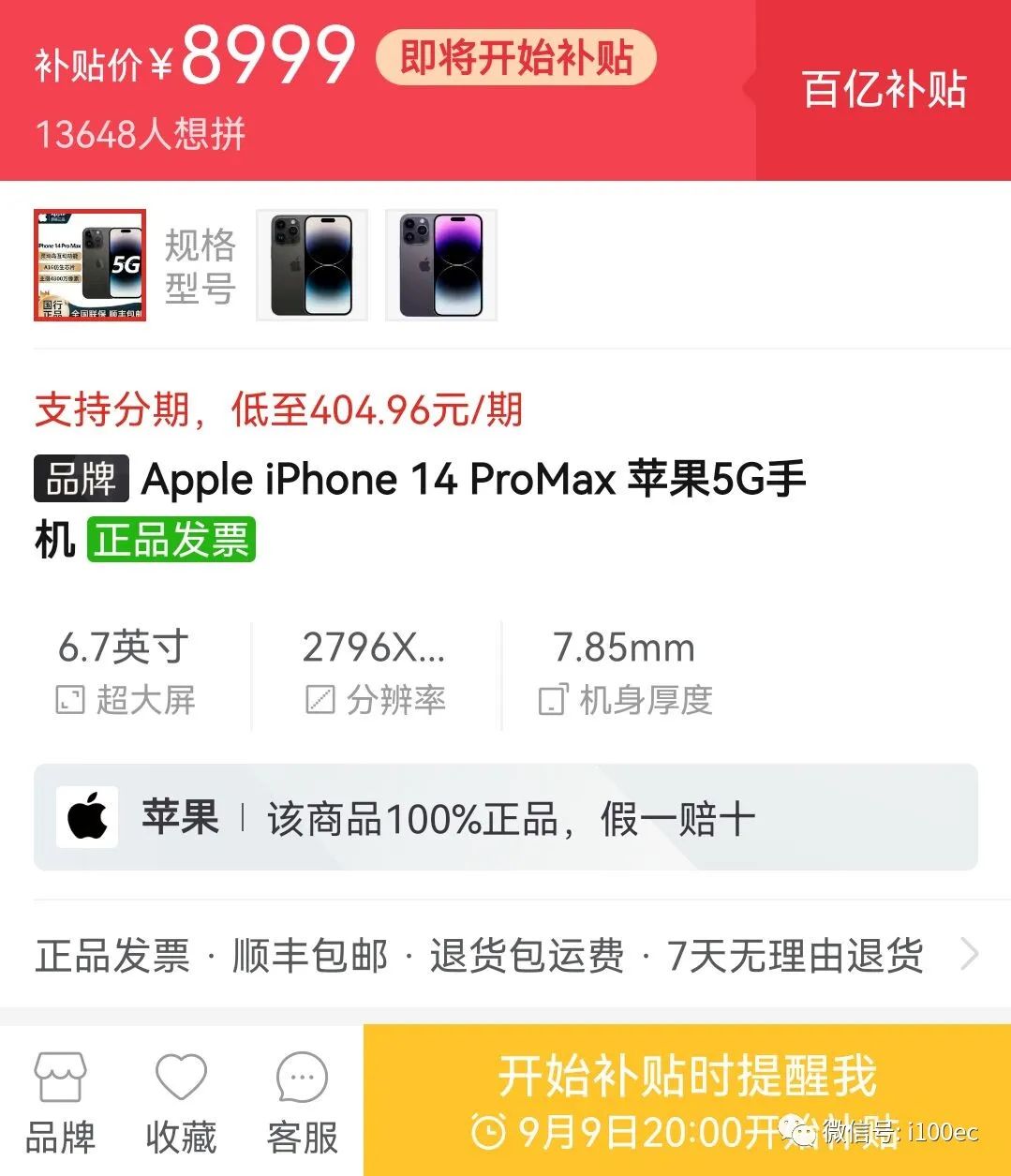 此外,iPhone 14系列率先发布的三款新机也已经在百亿补贴上线,起售价5599元,比官网便宜400元起步。iPhone 14到手价5599元起,比原价5999元便宜400元;iPhone 14 Pro到手价7499元起,比原价7999元便宜500元;iPhone 14 Pro Max到手价8499元起,比原价8999元便宜500元。可见,拼多多几乎是全网降价幅度最大的首发平台。