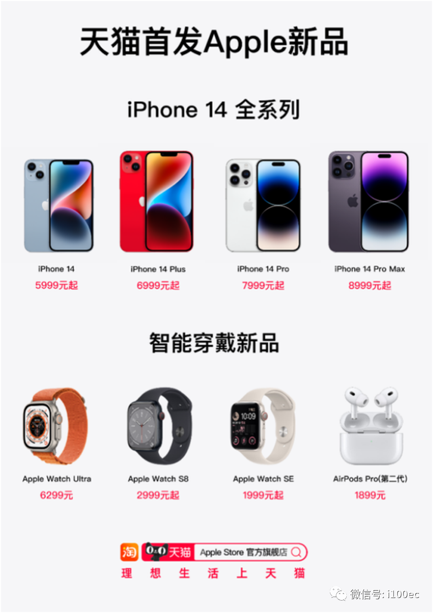 天猫Apple Store旗舰店显示了此次iPhone新品的详细价格:iPhone 14官方零售价5999元起,iPhone 14 Plus官方零售价6999元起,iPhone 14 Pro官方零售价7999元起,iPhone 14 Pro Max官方零售价8999元起。Apple Watch Ultra官方零售价 6299 元,第二代AirPods Pro官方零售价1899元。