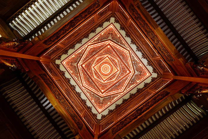 酒店的八角形彩色玻璃天顶犹如华盖,让自然天光恢宏洒落整个酒店大堂。曾被石膏板深藏数十年的大堂夹层极富装饰艺术感,重见天日后再现1930年代酒店鼎盛时期的金碧辉煌。曾于19世纪风行全球的拉利克艺术玻璃由法国大师雷内 · 拉利克创造,和平饭店完整保留了1920年代特别向法国拉利克水晶玻璃工坊定制的浮雕嵌饰。