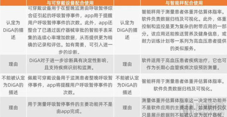 通过对比DiGA的描述说明不难发现,是否被认定为DiGA的关键在于软件是否可以对疾病的发现、监测及进一步诊断起到决定性影响。如果软件只是硬件功能的展现,没有进一步的延展,则无法被认定为DiGA。