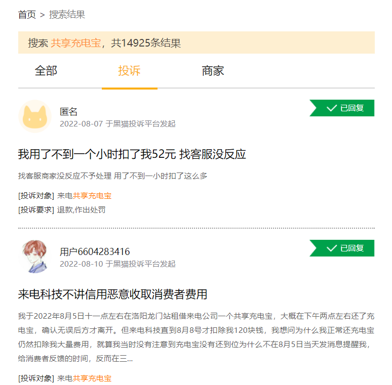 在黑猫投诉搜索“共享充电宝”,相关投诉共有14925条,其中多数都是扣费纠纷,包括机器卡住无法归还、小程序显示信息与实际归还点不符、归还之后未停止计费等,且涉及来电等多个品牌。