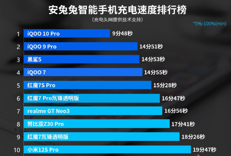 安兔兔近期发布的手机充电榜显示,榜单前十的机型里,120瓦是起步水平,其中功率最高的已经达到了200瓦快充。与大功率对应的是更短的充电时间,从5%至100%,榜单中最短耗时仅为9分48秒,榜尾第十名则是19分47秒。