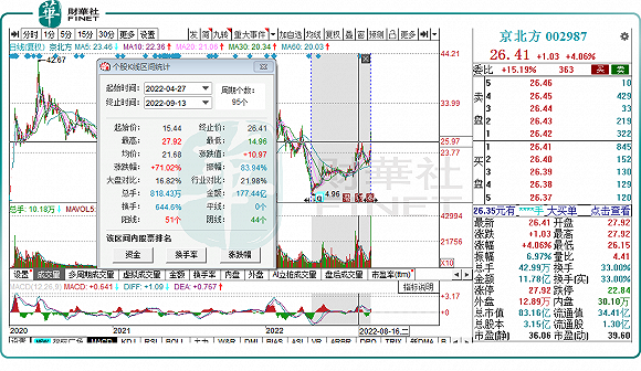 9月13日,京北方(002987.SZ)一度录得4天3板,不料护板效应不明显,盘中炸板后收涨4.06%,报收26.41元/股,全天换手率达33%。
