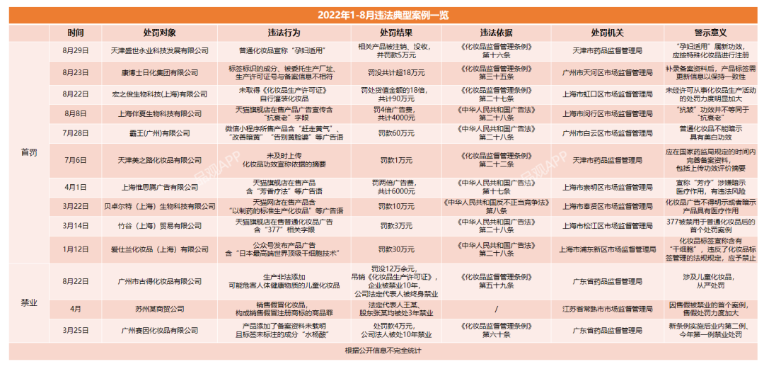 化妆品观察梳理发现,短短8个月,行业已至少发生了10起“首罚”案例,并开出了5张“禁业”罚单,如此处罚力度无疑给所有从业者敲响了警钟。