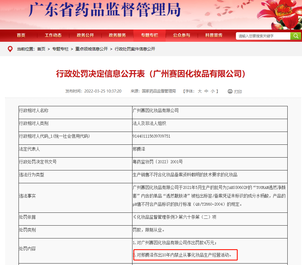今年,禁业处罚的范围则有所扩大,如,苏州某商贸公司因销售假冒注册商标日化用品,法定代表人王某、股东张某均被处3年禁业;广州赛因化妆品有限公司则因产品添加了备案资料未载明且标签未标注的成分“水杨酸”,公司法人被处10年禁业(详见《禁业10年!》)。