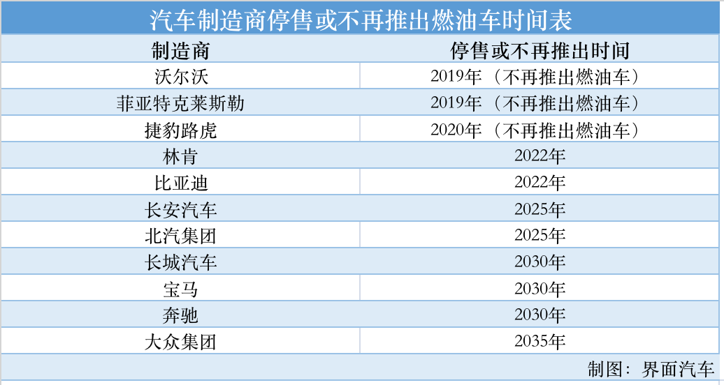 2019年,沃尔沃和菲亚特克莱斯勒集团便不再推出燃油车;捷豹路虎宣布自2020年起所有新发布车型均将实现电动化;林肯于2022年全面停售燃油车:北汽集团计划到2025年前停止自主品牌传统燃油乘用车在中国的生产和销售;宝马计划于2030年在欧盟停止销售燃油车;奔驰计划到2030年实现全面电动化;大众汽车集团计划在2035年前停产燃油车。