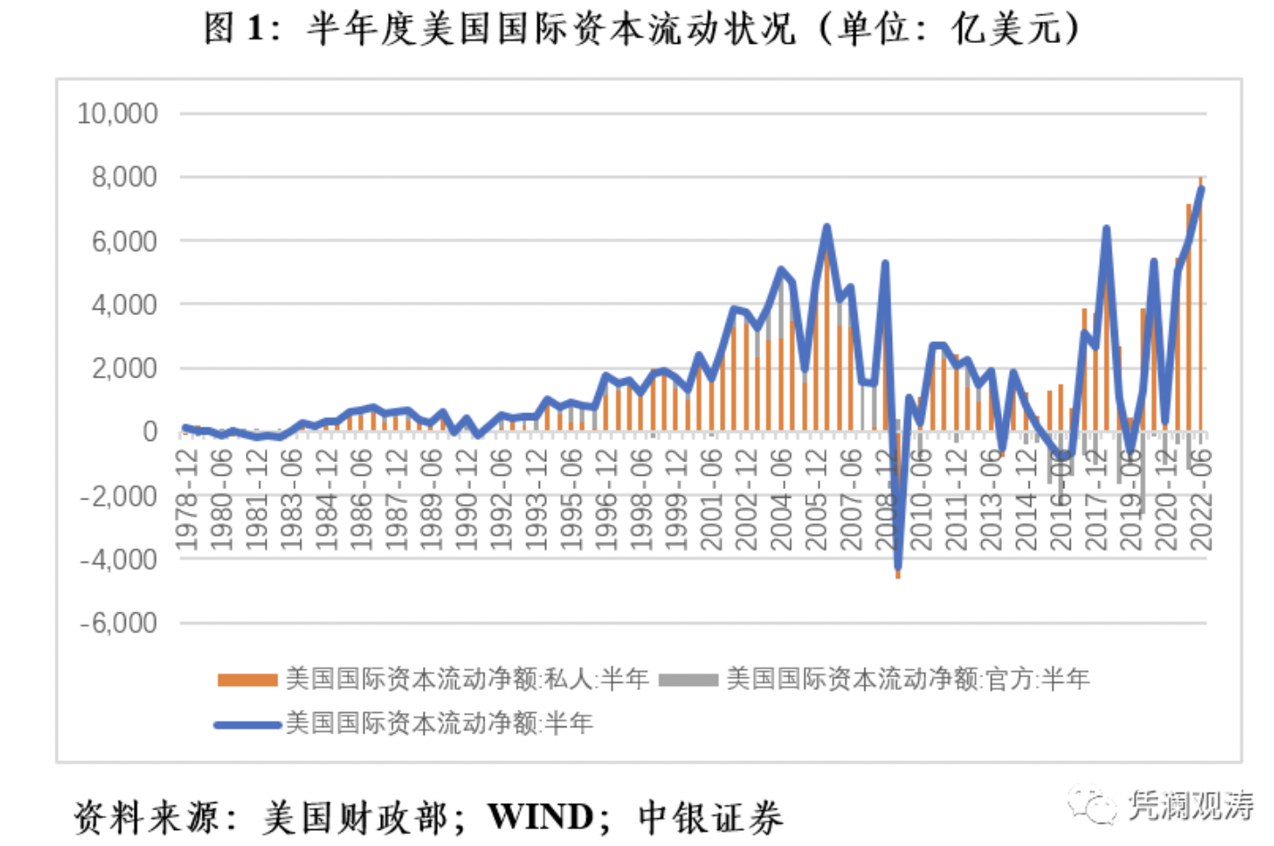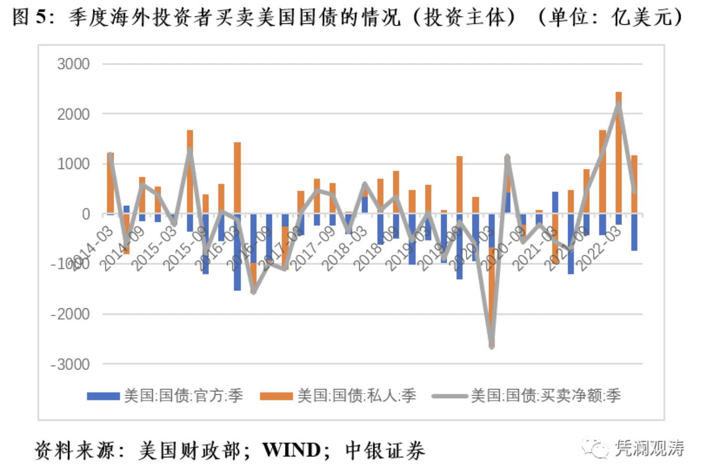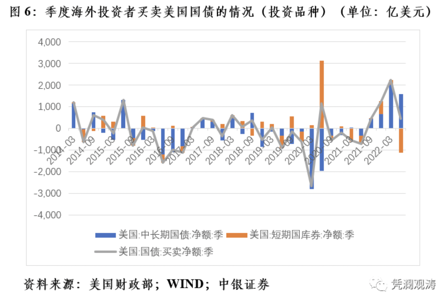 这符合无风险收益率上升,风险资产价格下修调整,资金逃向安全资产的金融常识。将短期美国国库券纳入,对海外投资者买卖美国国债的全口径情况一并考察后,结果显示,今年上半年,海外投资者增持美债2664亿美元,去年同期为减持1291亿美元(见图5)。