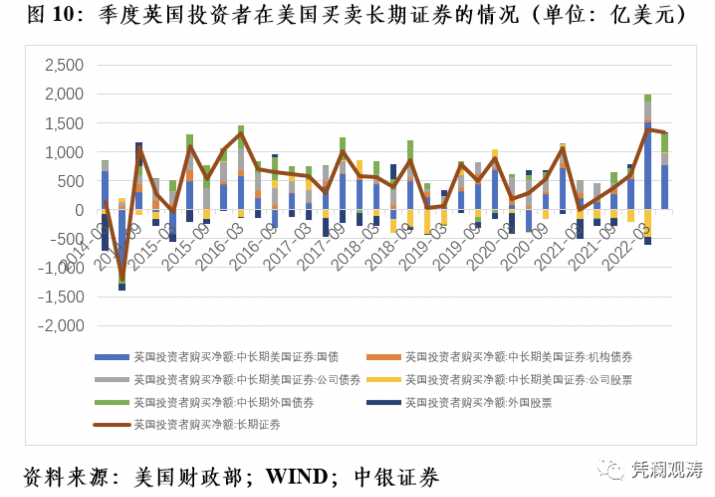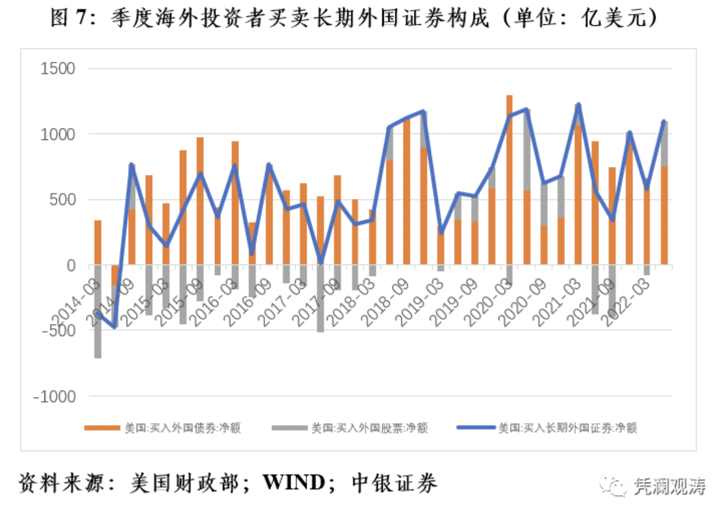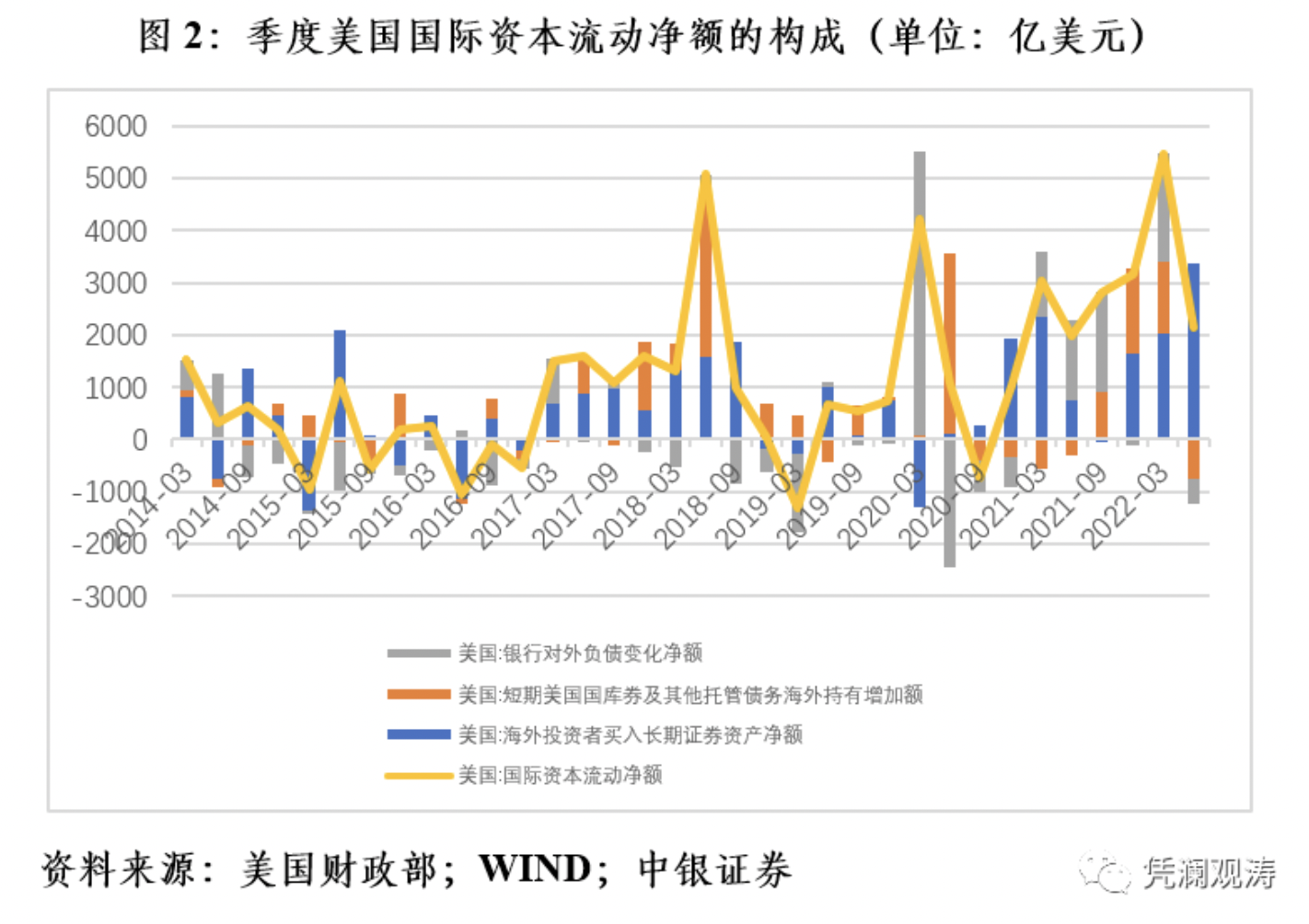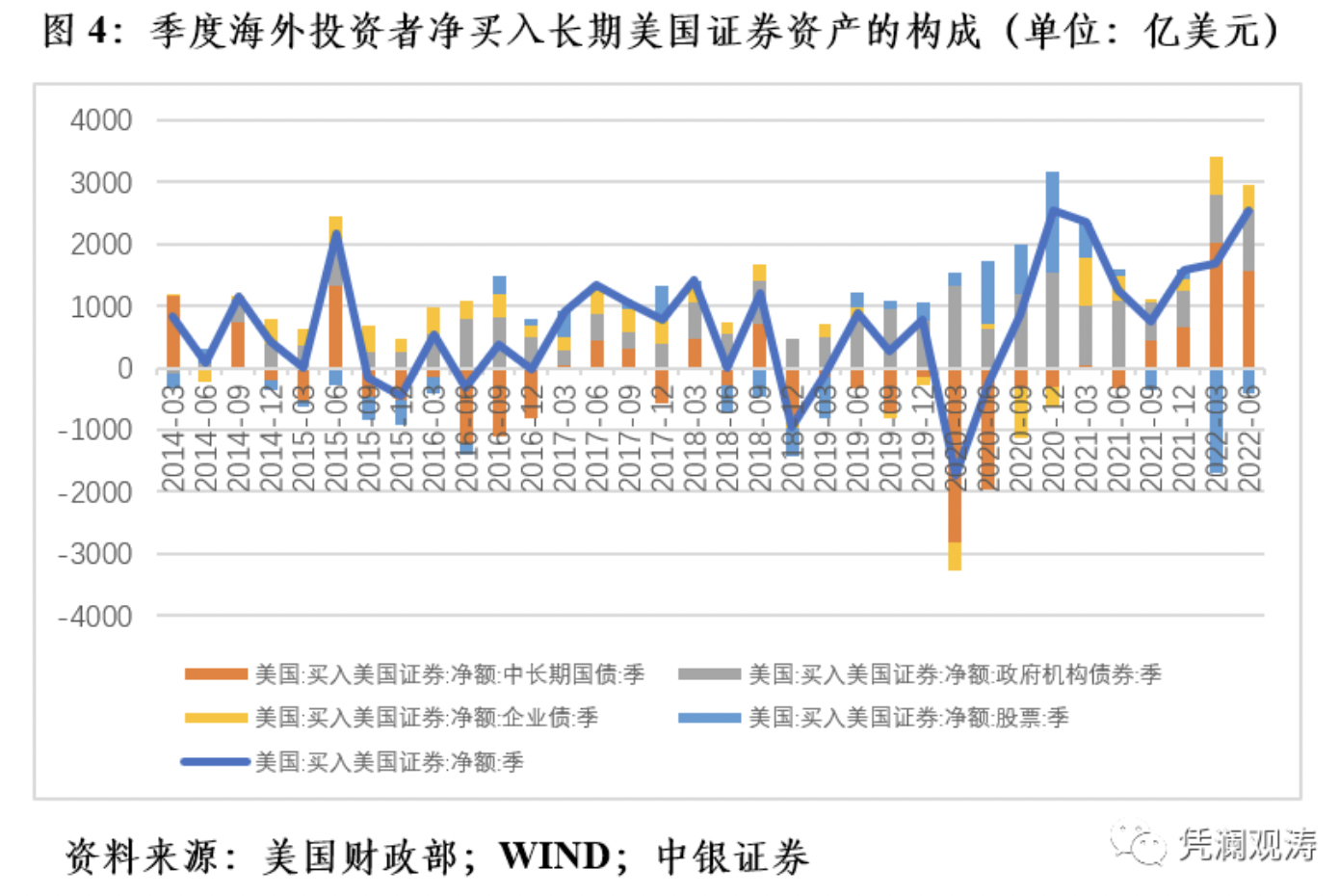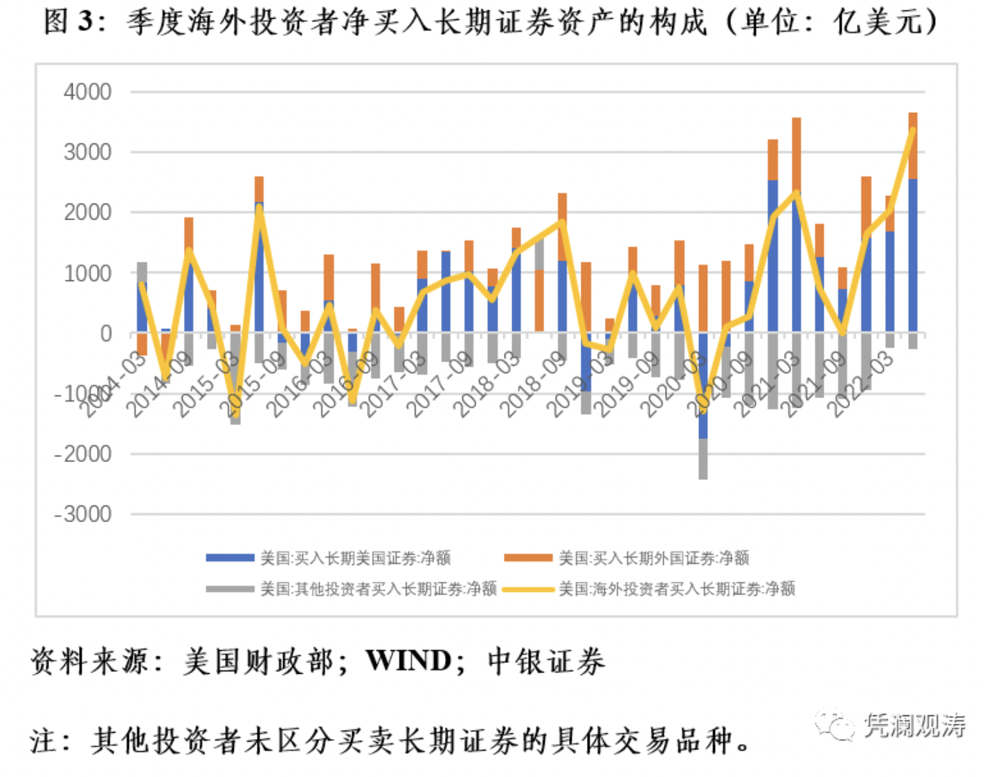 在TIC数据中,海外投资者在美国买卖证券资产包括三个部分,一个是长期证券资产,另一个是短期美国国库券及其他托管债务海外持有增加,再一个是银行对外负债变化。