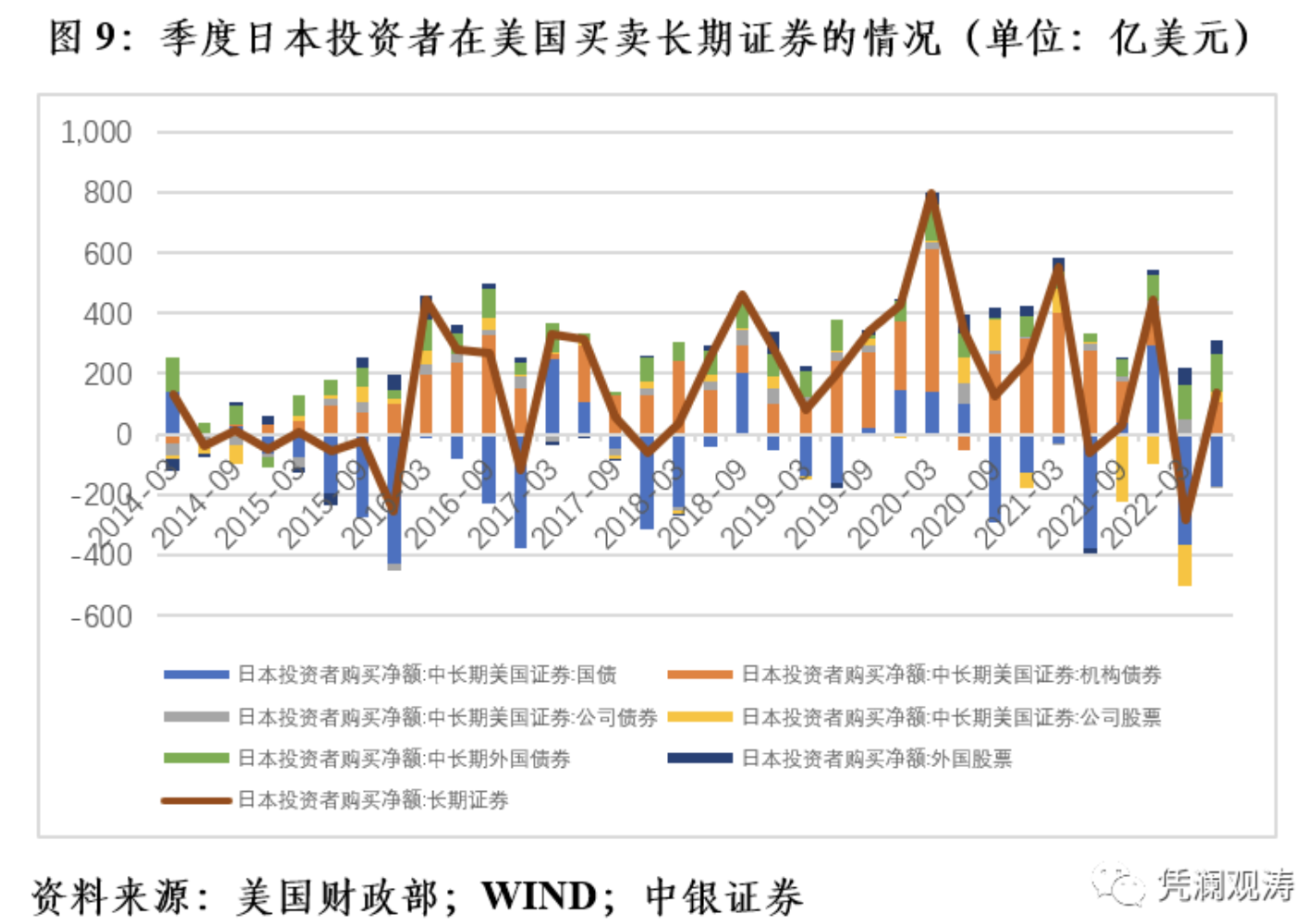 美债第一大海外投资者——日本,今年上半年减持了146亿美元长期证券资产,去年同期为增持490亿美元。其中,减持中长期美债535亿美元,同比多减32.0%;增持美国政府机构债105亿美元,少增84.6%;减持美国公司股票104亿美元,去年同期为增持83亿美元;增持长期外国证券345亿美元,多增2.03倍(见图9)。