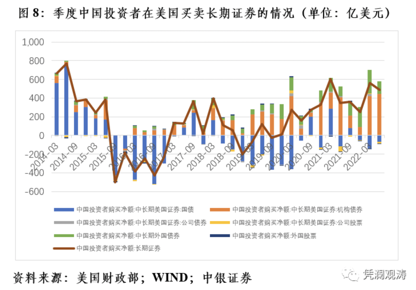 TIC数据显示,今年上半年,美债第二大海外投资者——中国投资者减持了中长期美债却增持了其他长期证券资产,总体表现为在美国增持了长期证券资产。同期,中国投资者在美国增持长期证券资产1045亿美元,同比多增9.5%。其中,减持中长期美债209亿美元,去年同期增持172亿美元;增持美国政府机构债867亿美元,多增49.6%;增持长期外国证券(包括股票和债券)371亿美元,多增60.2%。从更长时间看,这个趋势更加明显。2018~2021年,中国投资者累计增持长期证券2988亿美元。其中,分别减持中长期美债和美国股票1676亿和80亿美元,分别增持美国政府机构债和企业债3038亿和113亿美元,增持长期外国证券1593亿美元(见图8)。