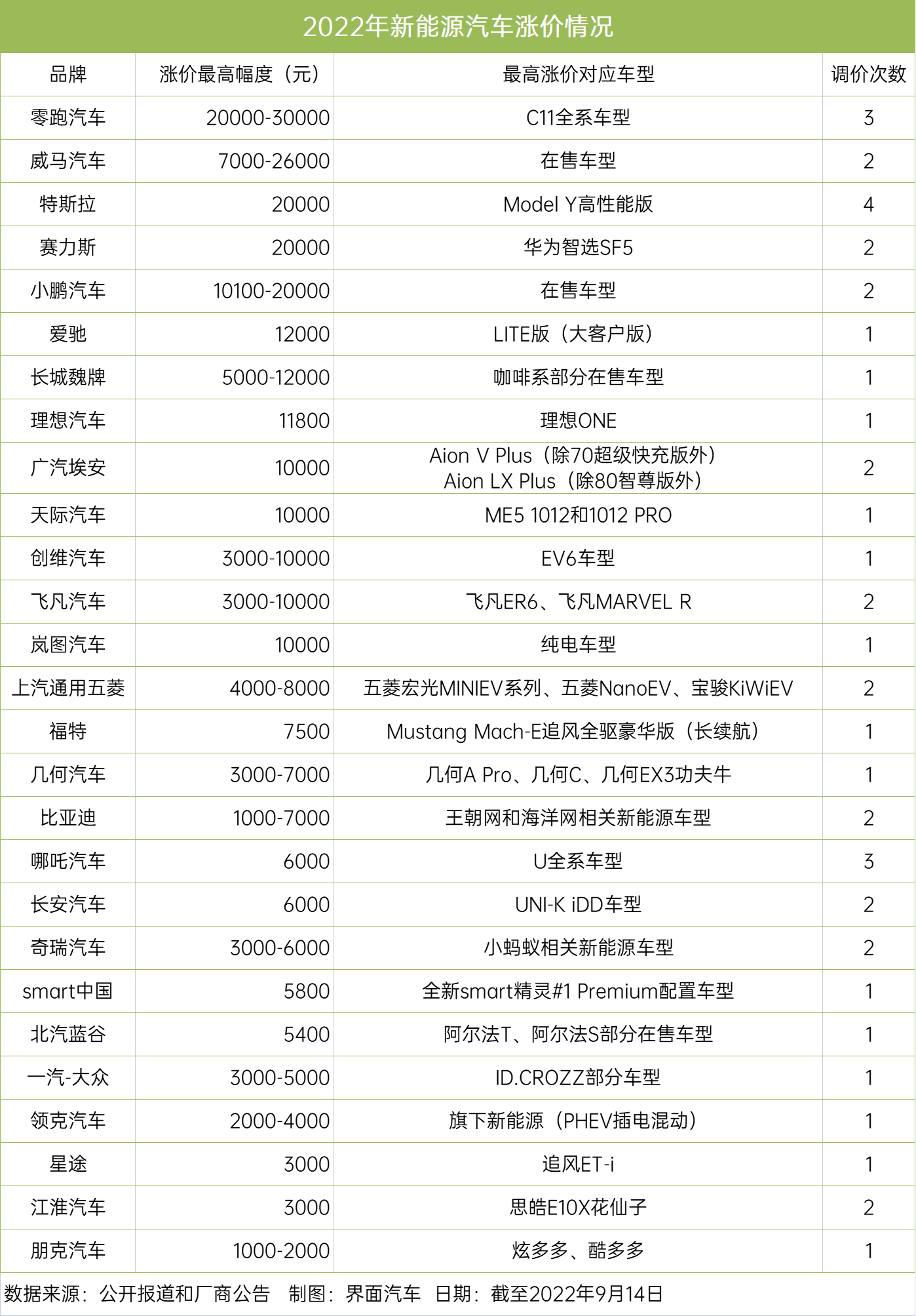 今年以来,新能源汽车迎来了多轮涨价潮,据界面新闻不完全统计,已有28家汽车公司宣布上调新能源汽车价格,过半数公司最高涨价达万元,并且多次宣布涨价。其中造车新势力零跑汽车宣布涨价2至3万元,特斯拉年内已进行4次调价。