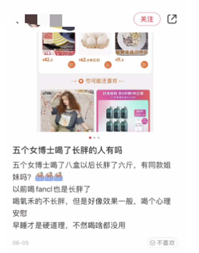 在小红书上和抖音上,消费者更普遍的负面作用反应是失眠、长胖、掉头发、生理期推迟或者紊乱。一位消费者告诉电厂,她喝完40瓶之后体重增加了6斤,这期间她还规律的去上瑜伽课,并且并未暴饮暴食。等到她把五个女博士停掉之后,体重也慢慢减回4斤。