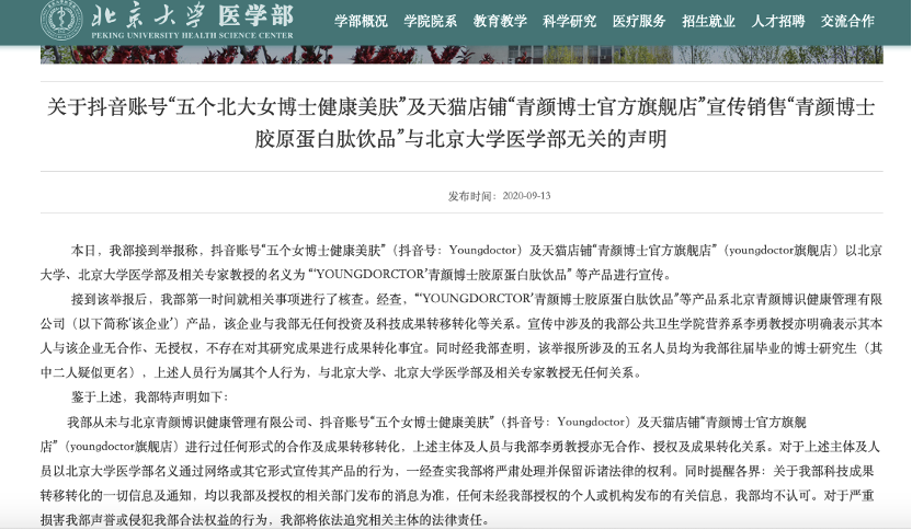 至今,在北大医学部网站上,还挂着其在2020年发布的声明,该声明称:“我部从未与北京青颜博识健康管理有限公司、抖音账号‘五个女博士健康美肤’等进行过任何形式的合作及成果转移转化,对于上述主体及人员以北京大学医学部名义通过网络或其它形式宣传其产品的行为,一经查实我部将严肃处理并保留诉诸法律的权利。”