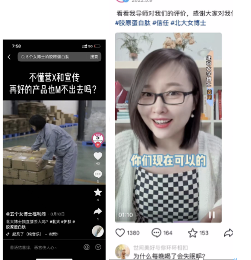 五个女博士所属公司是北京青颜博识健康管理有限公司,3月份其销售额突破3000万,主要产品就是口服胶原蛋白肽。这家公司对外宣称创始人是北大毕业的5位女博士,前期靠着“北大女博士”的光环营销和抖音流量扶持,这款产品在抖音上迅速出圈,目前已经在北京开出第一家线下店。