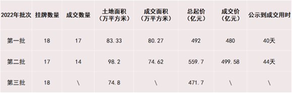可以看到,本批次预申请的地块宗数和上两批次相差不大,出让土地面积略微下调。根据此前批次,从挂牌公示到成交的用时可能会在40天左右,也即第三批次集中供地土拍可能会在9月中下旬进行。