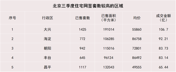 从区域分布看,本季度网签区域成交额较高的区域分别是大兴、海淀、朝阳、丰台和昌平。其中,大兴以网签1425套,成交106.7亿元居于区域成交金额首位。