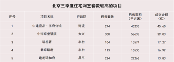 本季度网签项目成交额较高的项目分别是中建壹品、中海京叁號院、端礼著、北京瑞府和建发珺和府。