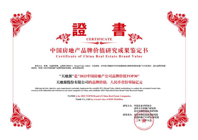 9月15日,“2022中国房地产品牌价值研究成果发布会暨第十九届中国房地产品牌发展高峰论坛”在北京雁栖湖国际会议中心盛大举办。会上发布了《2022中国房地产品牌价值研究报告》,天地源凭借不断提升的品牌影响力,荣获“2022中国房地产公司品牌价值TOP30”殊荣,位列第23名,较去年上升11位,同时斩获“2022中国房地产住宅开发专业领先品牌——文化地产”奖项。