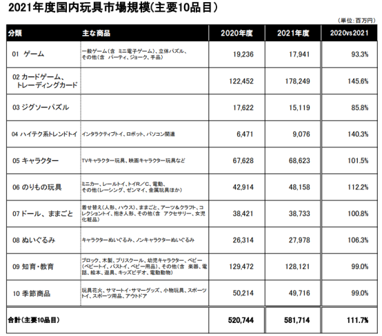 其中,十大品类玩具中的卡牌游戏·集换式卡牌,市场规模同比增长45.6%,达到1782.49亿日元。