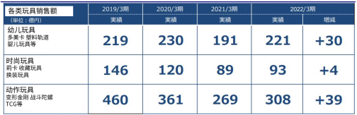 上图是多美三大类目玩具销售额推移数据,虽然没有具体的TCG销售额,但可以看到包括TCG在内的动作玩具销售额正在从疫情的打击中回复过来,2022年3月期销售额为308亿日元。
