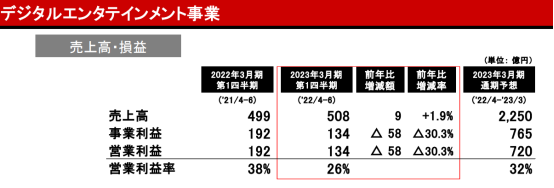 Konami的2023年3月期一季报显示(2022.4-2022.6),其数字娱乐事业销售额为508亿日元,同比增长1.9%,营业利润134亿日元,同比下降30.3%。