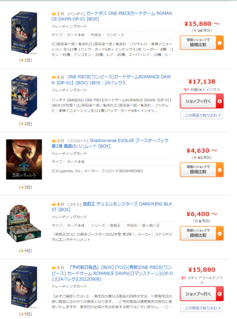 文创潮查阅了日本购物比价网站kakaku给出的近三个月日本TCG热销排行榜,注意到万代于今年7月推出的海贼王集换式卡牌(下文简称OPCG,One Piece Card Game)几乎横扫前五,各大店铺频频缺货,成为今年新晋最热门的TCG之一。
