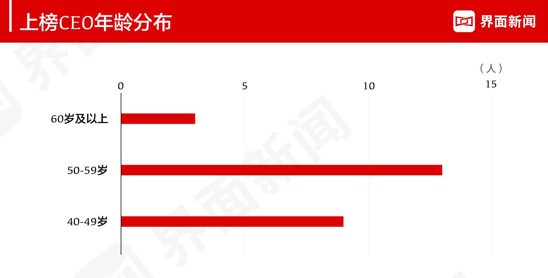 上榜的25位CEO平均年龄51岁,其中最年轻的当属贝壳的彭永东,今年42岁。