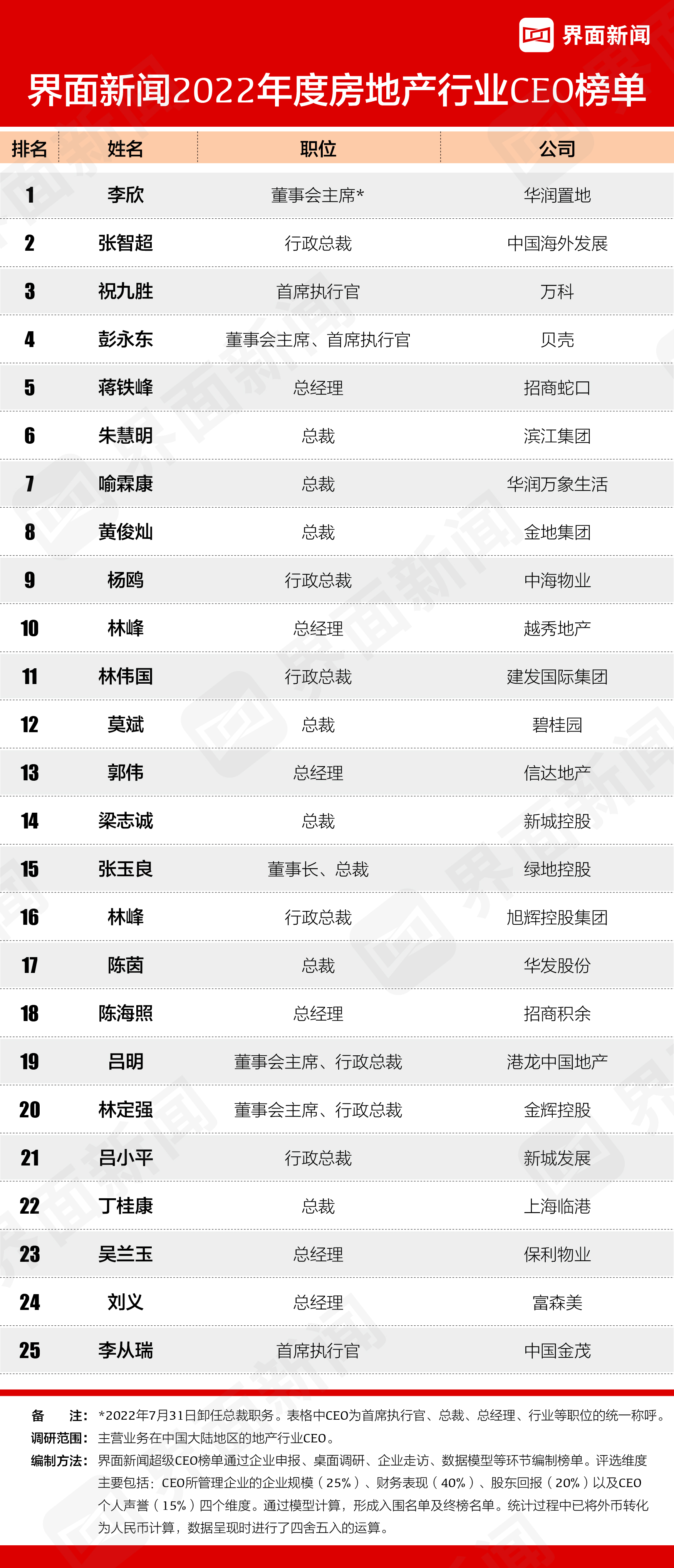 本篇中CEO为首席执行官、总裁、总经理、行长等职位的统一称呼。我们的研究面向中国地区房地产企业CEO。界面新闻超级CEO榜单通过企业申报、桌面调研、企业走访、数据模型等环节编制榜单。评选维度主要包括:CEO所管理企业的企业规模(25%)、财务表现(40%)、股东回报(20%)以及CEO个人声誉(15%)四个维度。通过模型估算,形成入围名单及终榜名单。统计过程中已将外币转化为人民币计算,数据呈现时进行了四舍五入的运算。